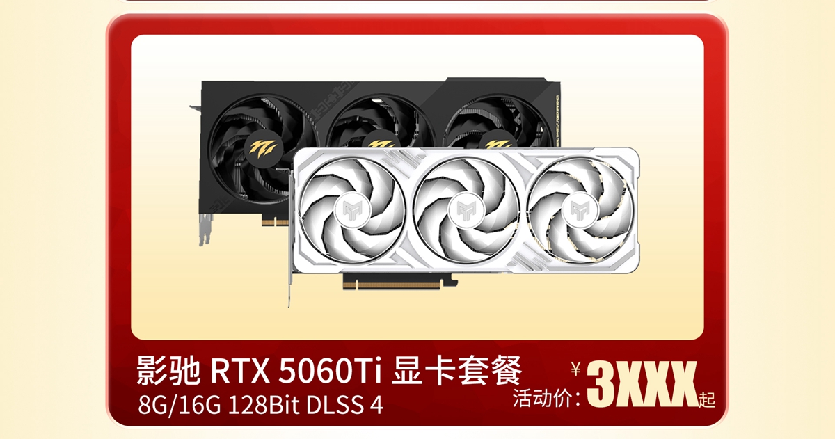 影驰 RTX 5060 Ti 金属大师 OC 8G系列:限时88VIP价格3399元起;搭载NVIDIA Blackwell架构与最新DLSS 4.5技术,2K分辨率下轻松高帧畅玩3A游戏,同时兼容小尺寸机箱。另外,选择加购影驰GL600电源套装,价格同样为3399元起。