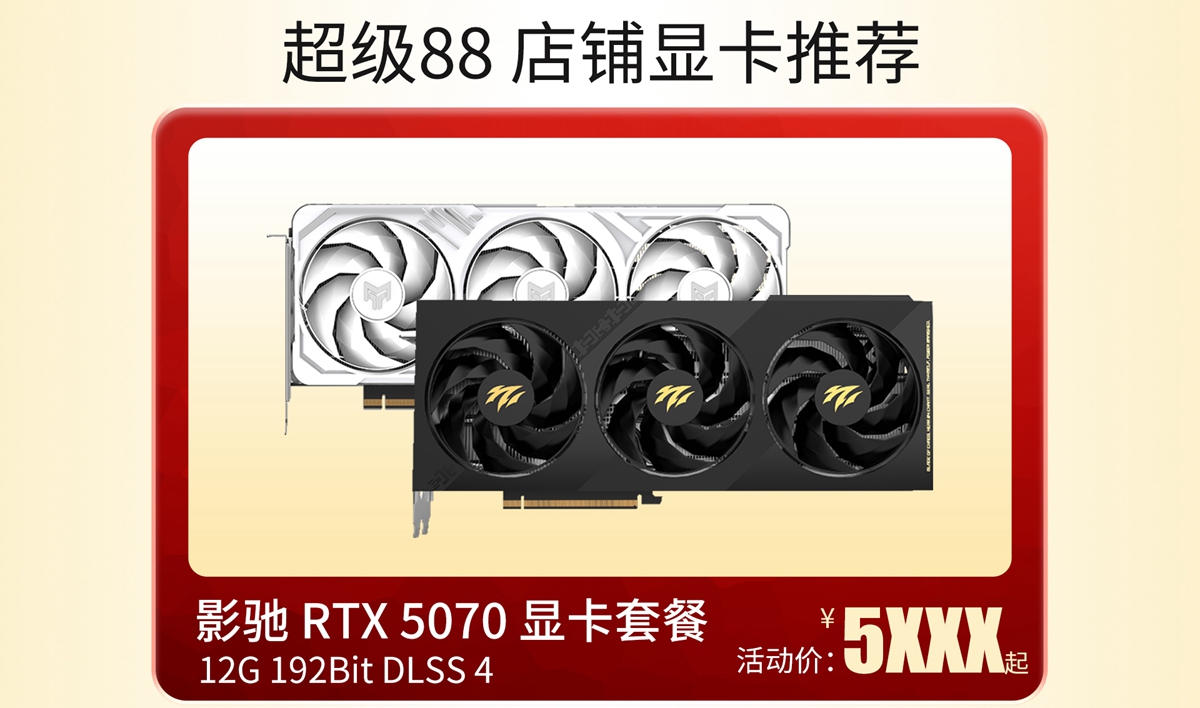 影驰 RTX 5070 刃系列 OC:限时88VIP价格5099元起。配备12GB显存,配合六倍多帧生成技术,2K光追游戏无压力,甚至可挑战4K分辨率下的3A大作。其可拆卸式ARGB灯牌能安装在显卡侧面或顶部,为你的整机增添个性光彩。