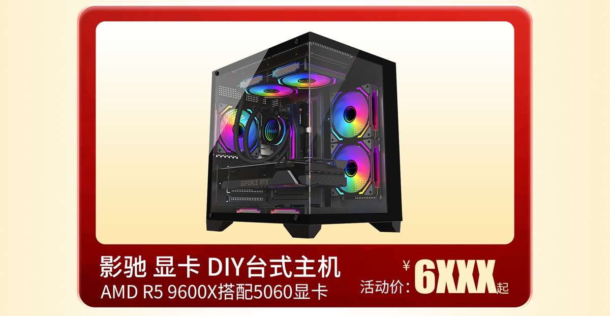 影驰AMD平台整机,限时88VIP价格6399元起。搭载影驰 RTX 5060系列显卡、B650M-F D5主板、R5 9600X CPU,配合16GB D5内存与1TB SSD,无论是1080P还是2K分辨率,都能沉浸式体验时下主流游戏。