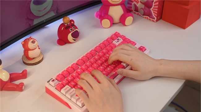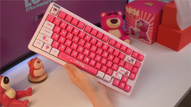 iLovbee B75 草莓熊为迪士尼正版授权,是品牌首款迪士尼联名系列作品。键盘采用独家原创草莓熊主题设计,历经多轮打样迭代,配色饱满贴合正版迪士尼草莓熊IP形象、外观细节处理恰到好处,同时背板设计图案经过多次调研优化,完美呼应键盘正面草莓熊可爱软萌的形象,保持键盘整体一致的美观以及辨识度,使其不止是一把输入工具,更是值得玩家收藏的外设佳品。